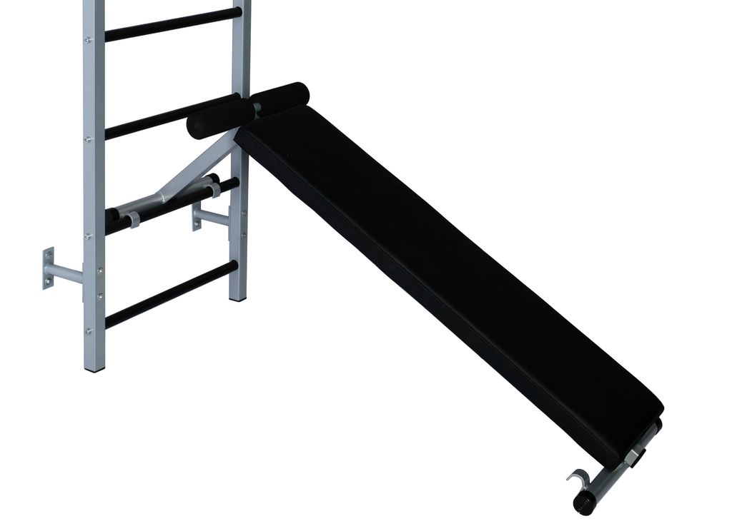 Универсальная скамья, которая увеличивает количество выполняемых упражнений на шведской стенки почти в ДВА раза! На скамье можно выполнять самые разные упражнения с гантелями и штангой, а установив наклонное положение - можно качать пресс. Скамья вообще не занимает места, т.к. складывается вдоль шведской стенки.